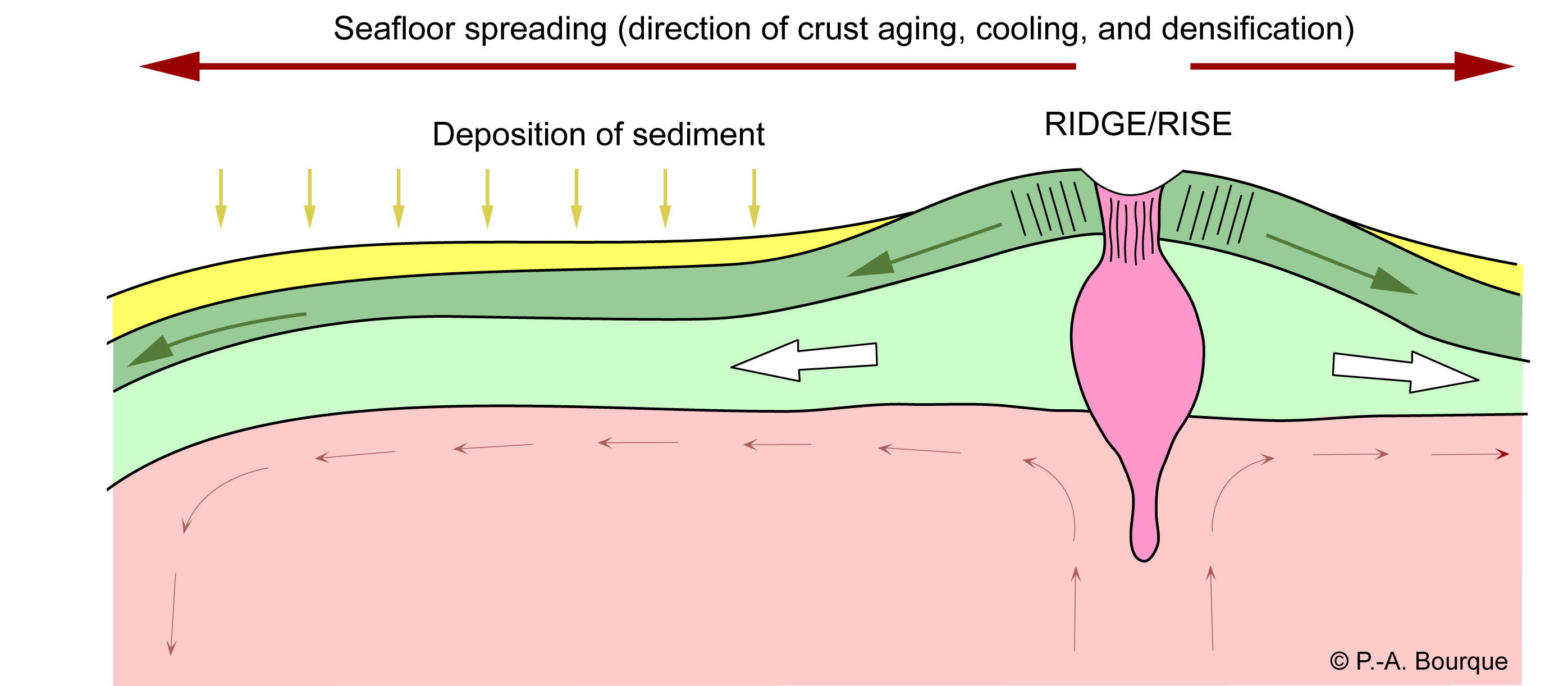 The mechanism by which new seafloor is created along the rift at the crest of a mid-ocean ridge as adjacent plates move apart. The crust separates along the rift, and new seafloor forms as hot new crust upwells into these cracks. The new seafloor spreads laterally away from the rift and is replaced by even newer crust in a continuing process of plate creation (Grotzinger et al., 2007).
