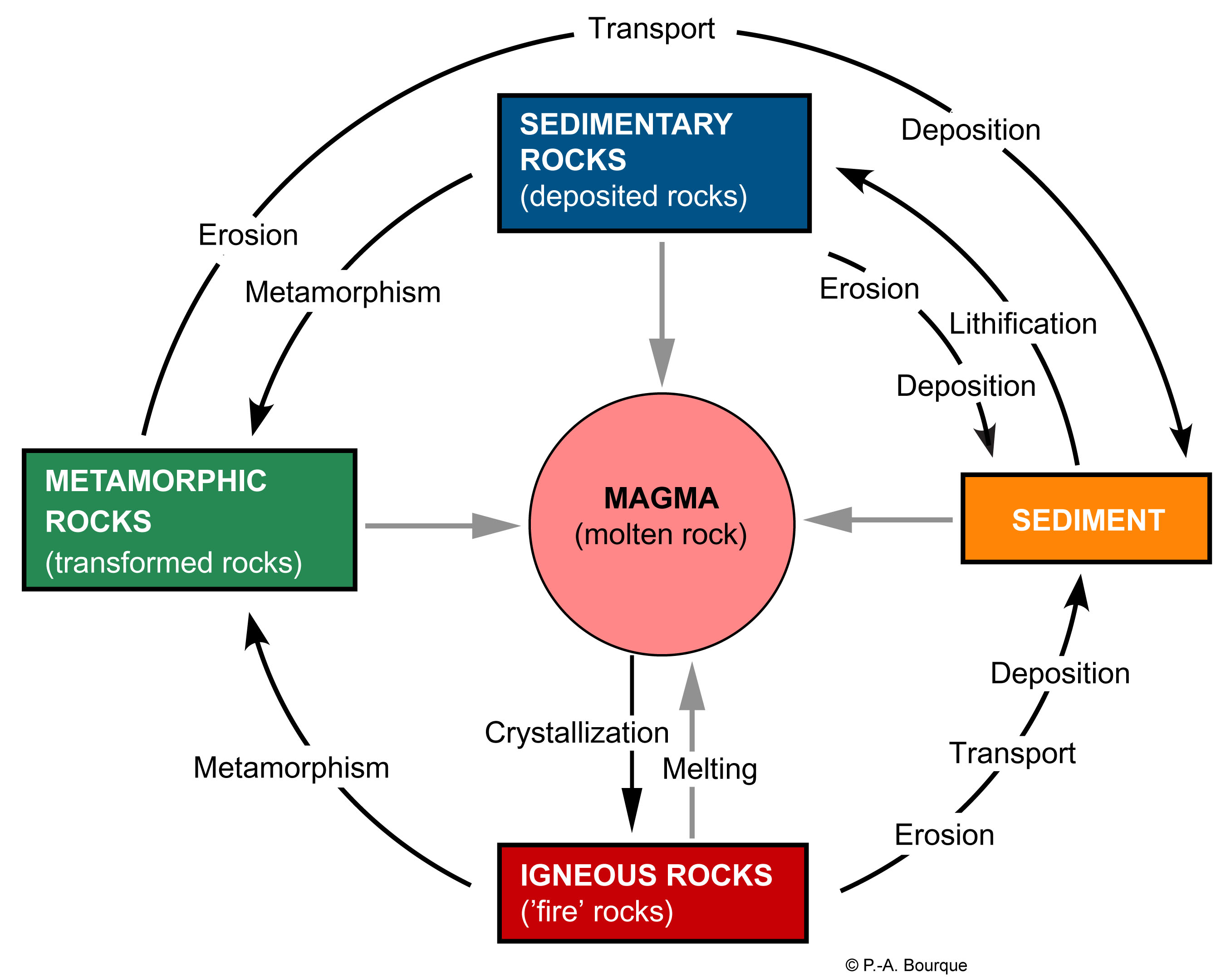 A model that illustrates the origin (in terms of processes), and the interrelationship between the three basic rock types. Examples of rock forming processes include: crystallization, uplift, erosion, burial, cementation, deformation, etc.