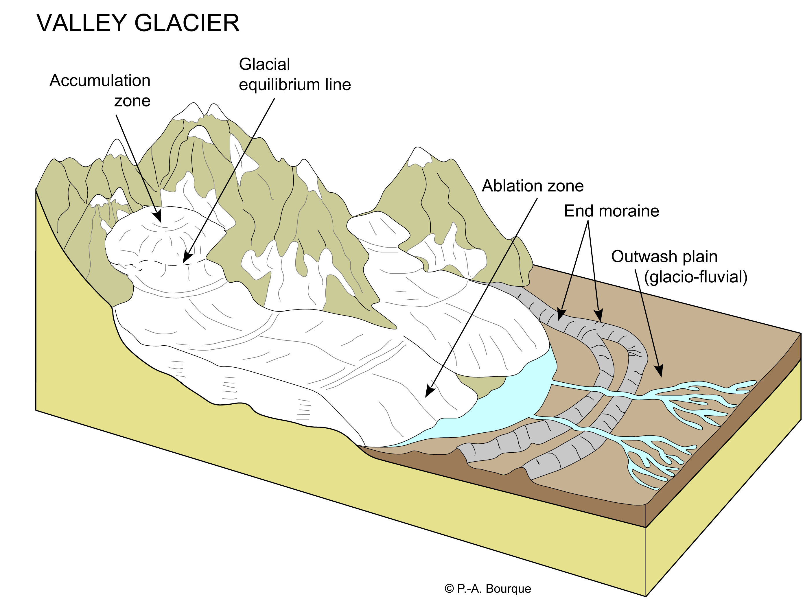 Valley Glacier (syn.: Alpine Glacier)  Glacier de vallée (syn: glacier alpin)