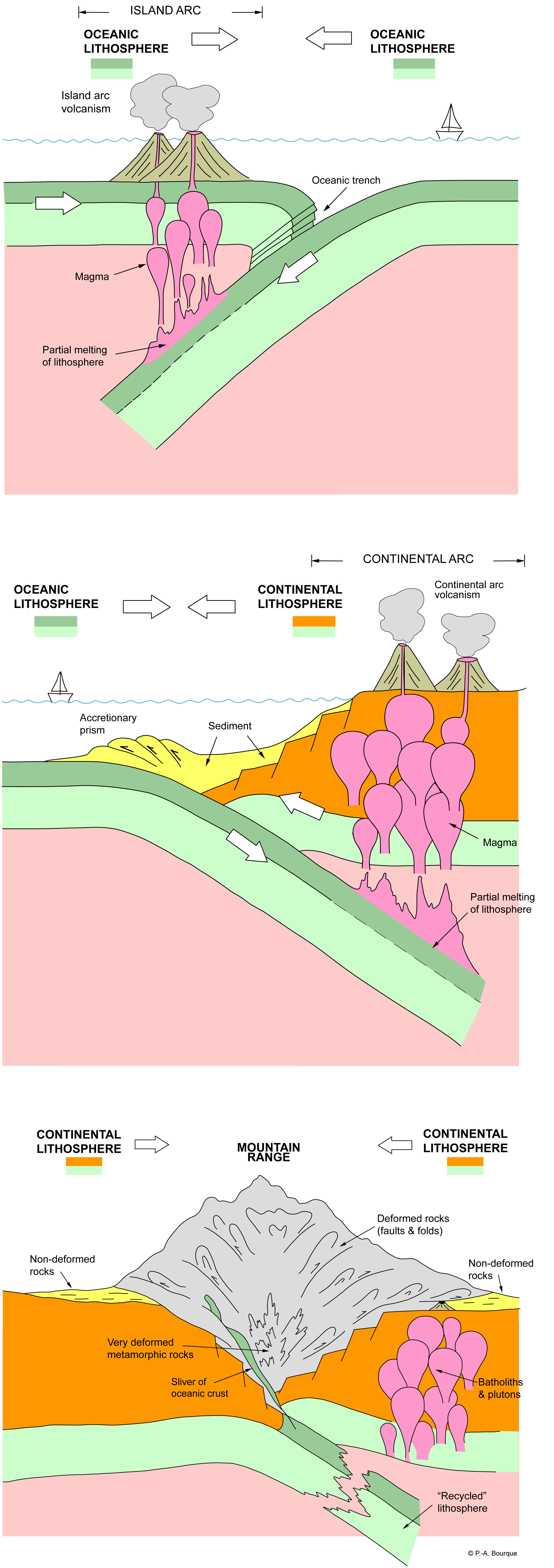A boundary between two tectonic plates that are moving toward each other. This type of plate boundary is said to be destructive as a portion of the lithosphere is recycled into the asthenosphere.