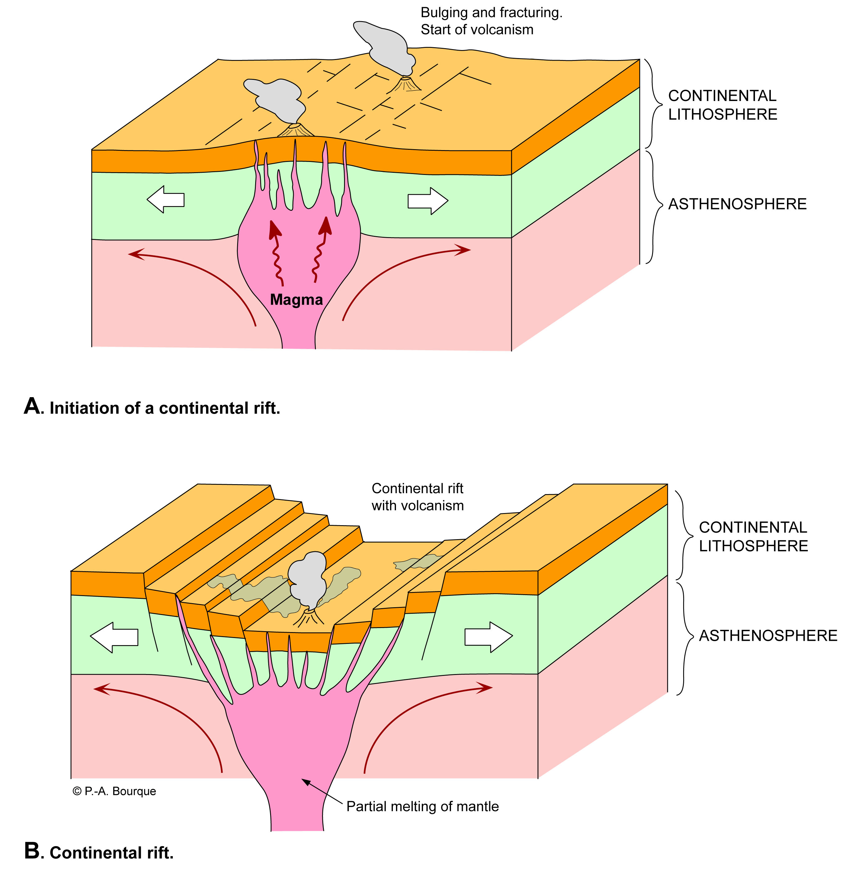 A long and narrow trough within the continental lithosphere developped by the stretching and thinning of the lithosphere, and characterized by the downward movement of lithospheric blocks along normal faults. The formation of a continental rift may lead to the formation of a new ocean basin.
