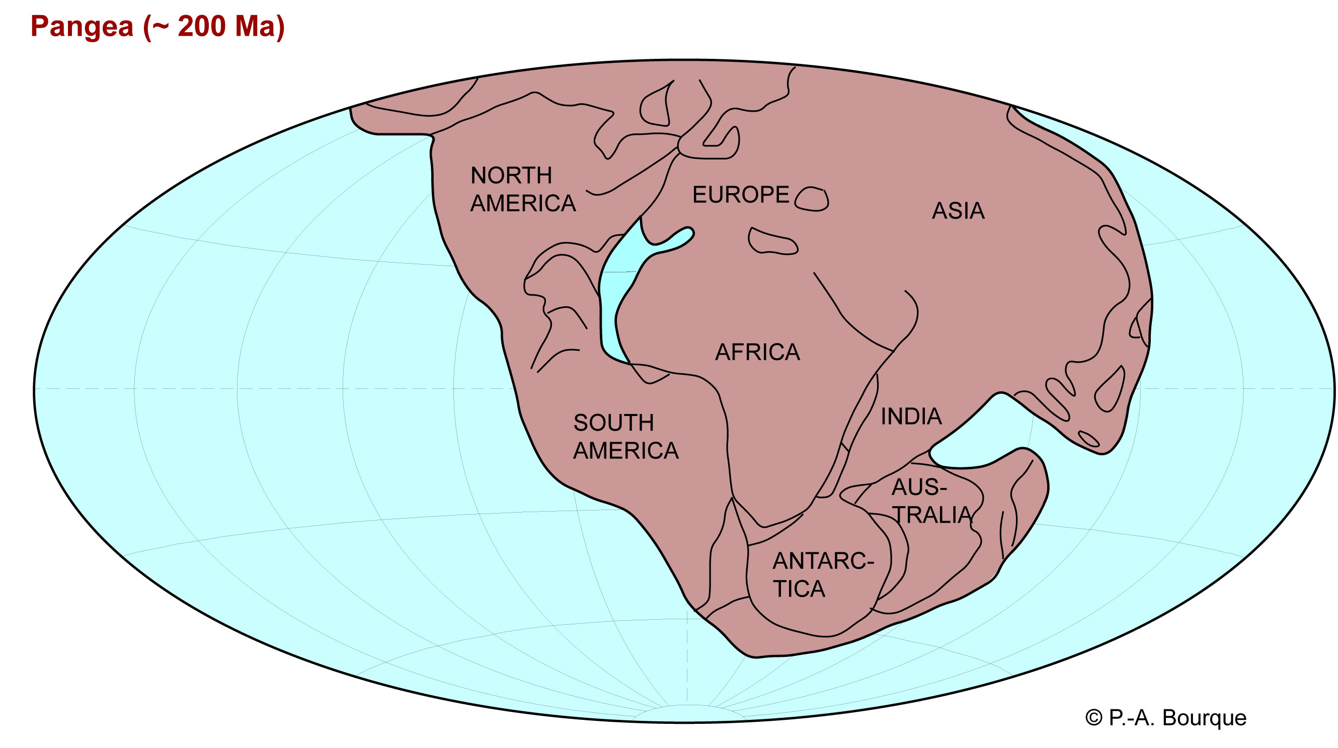 A supercontinent that coalesced in the latest Paleozoic era and comprised all present continents. The breakup of Pangaea began in Mesozoic time (~ 200 million years ago), and initiated the formation of the Atlantic Ocean (adapted from: Grotzinger et al., 2007).