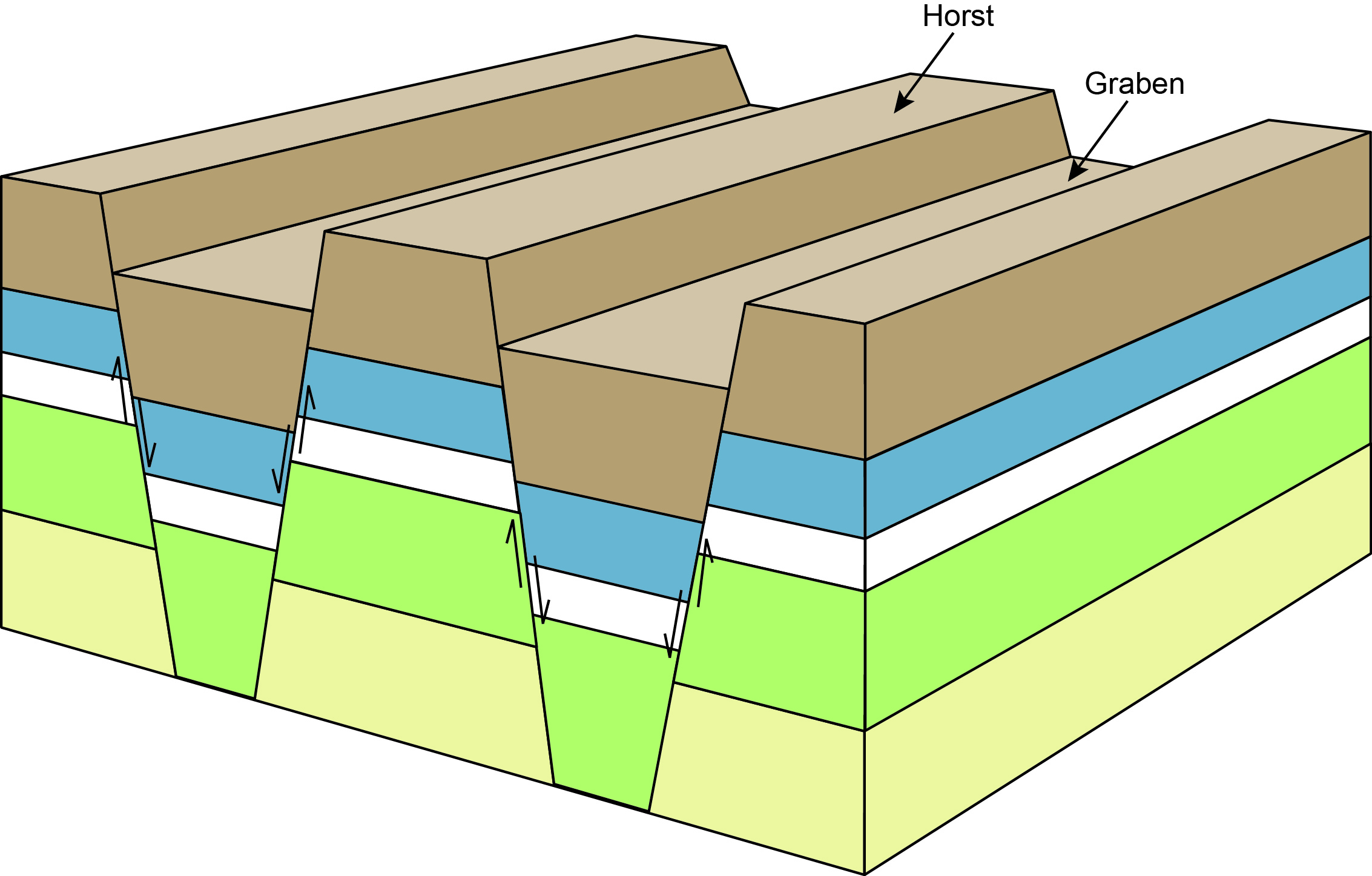 An elongated uplifted block of crust, bounded on both sides by normal faults the dip away from the interior of the horst (adapted from: Neuendorf et al., 2005).
