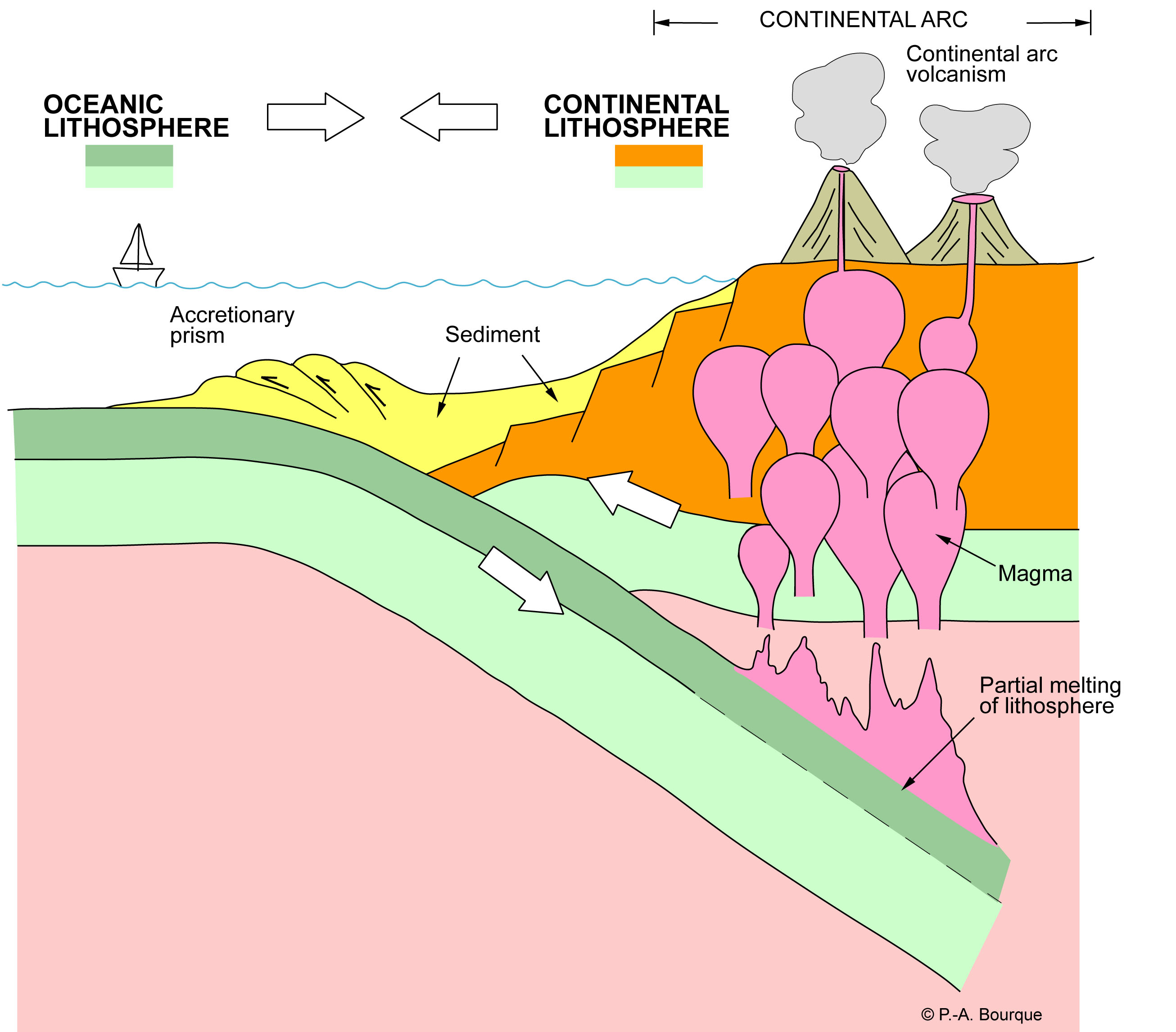 A linear or arc-shaped chain of volcanoes (and/or magmatic activity) formed in continental lithosphere at a convergent plate boundary. Results from the convergence of oceanic lithosphere with continental lithosphere.