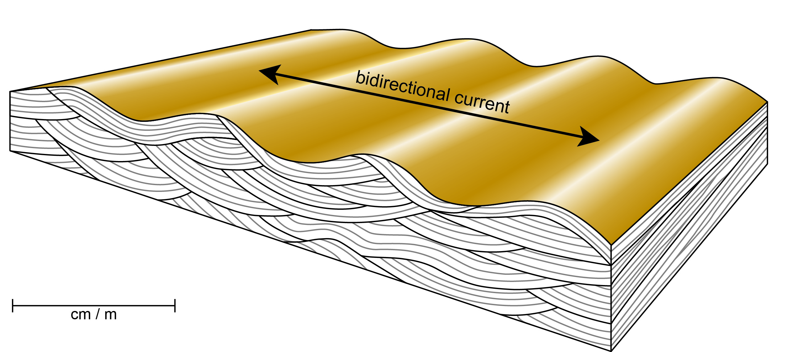 A symmetric ripple mark having a sharp, narrow, and relatively straight crest between broad rounded troughs. Oscillatory ripples (also called wave ripples) form on unconsolidated sedimentary substrates affected by the oscillatory flow generated by waves. Current is bidirectional and in an orientation that is perpendicular to the crestlines of the ripples.