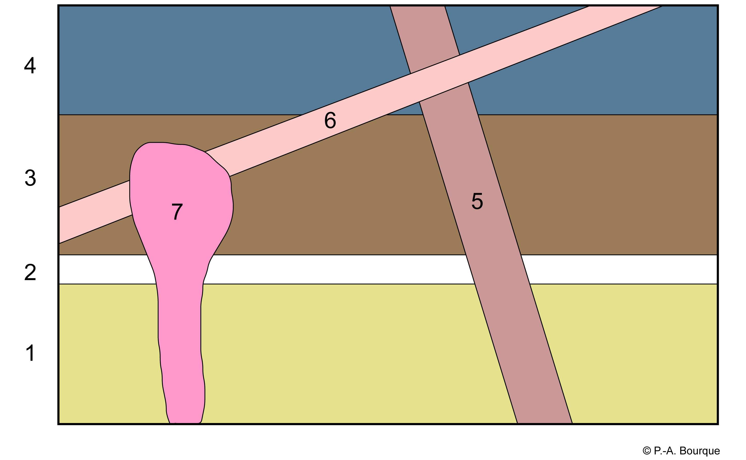 A principle that states that a disrupted pattern (examples of patterns: foliation, bedding, folding) is older than the cause of its disruption (examples of disruptions: dyke, fault). For example, an igneous intrusion that cross-cuts the foliation of a metamorphic rock is younger than the metamorphic rock.