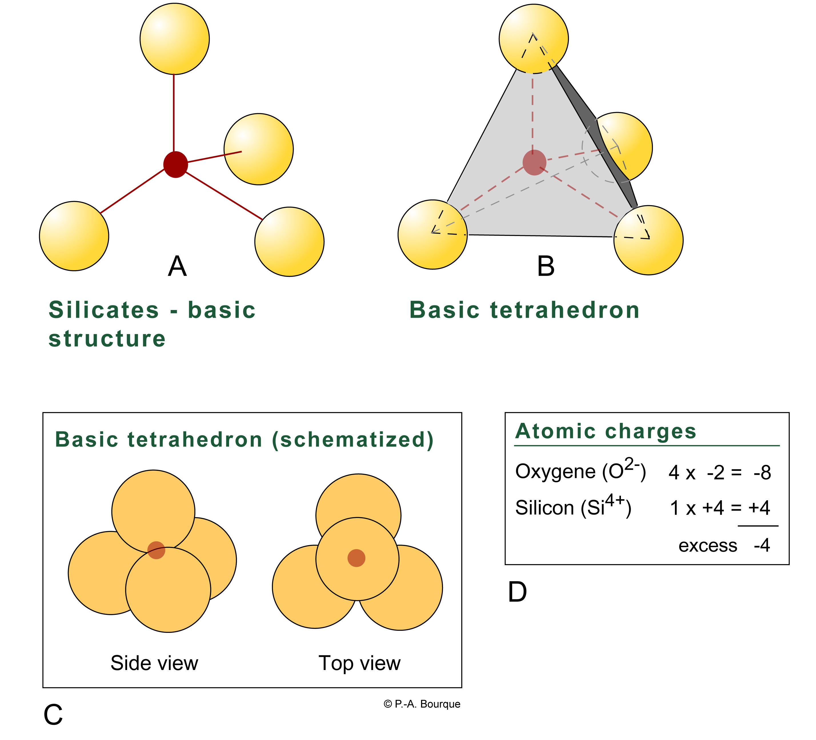A class of minerals that have the silicon-oxygen tetrahedron as their basic structure. They are further subdivided into subclasses based on the type of grouping of the silicon-oxygen tetrahedral (e.g. single chain, sheets, 3D framework, etc.). Silicates are the most abundant minerals in the Earth's crust and represent 95% of the volume of the crust. More than half of the 22 minerals that will be systematically studied in the lab portion of this course are silicates.