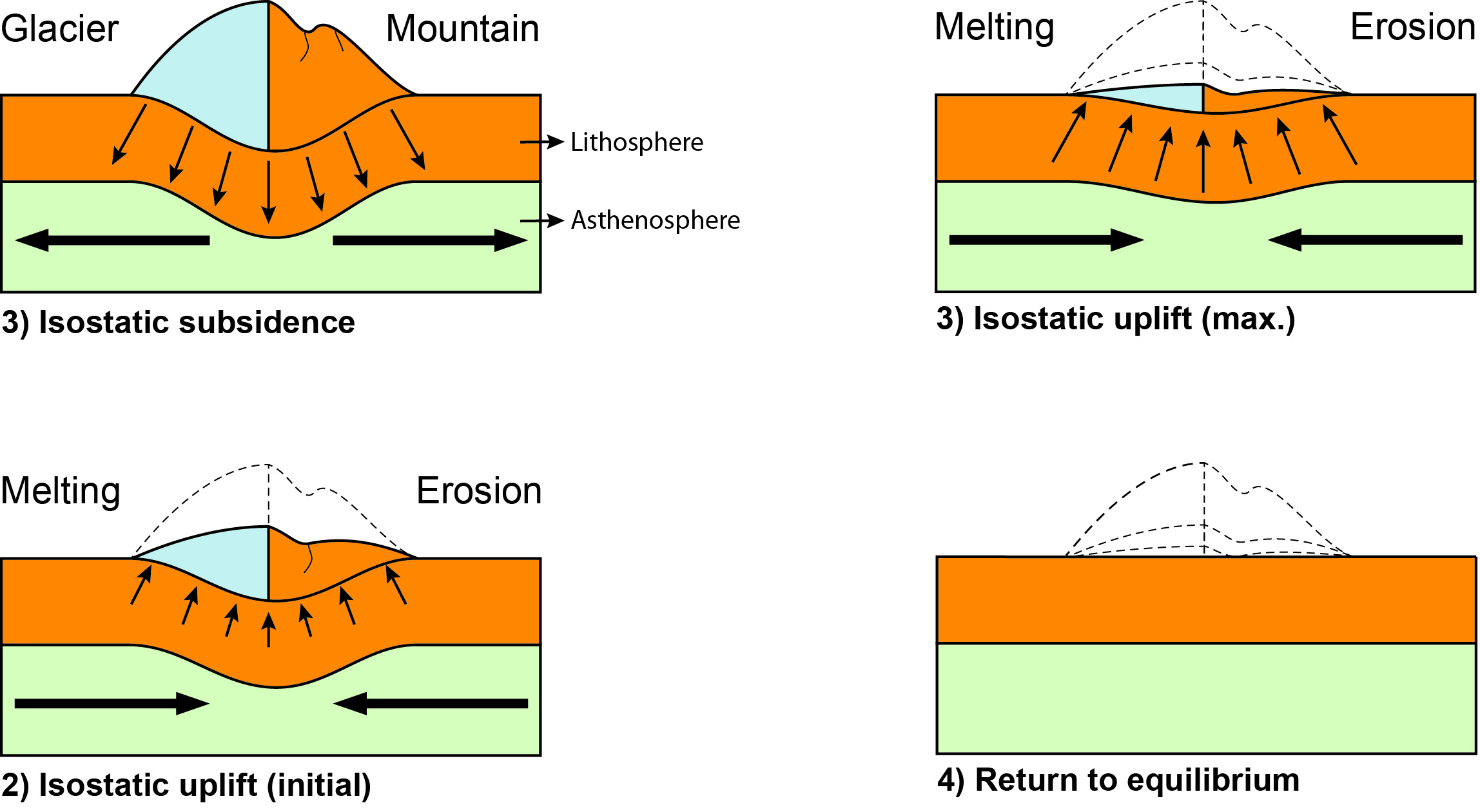 The adjustment of the lithosphere in response to changes in crustal loading by ice, water and sediments. Loading of the lithosphere leads to isostatic depression (lowering). Removal of the load results in isostatic uplift (adapted from: Neuendorf et al., 2005). The term “subsidence” is used to designate a downward movement of the lithosphere, while the terms “uplift” or “rebound” are used designate an upward movement.