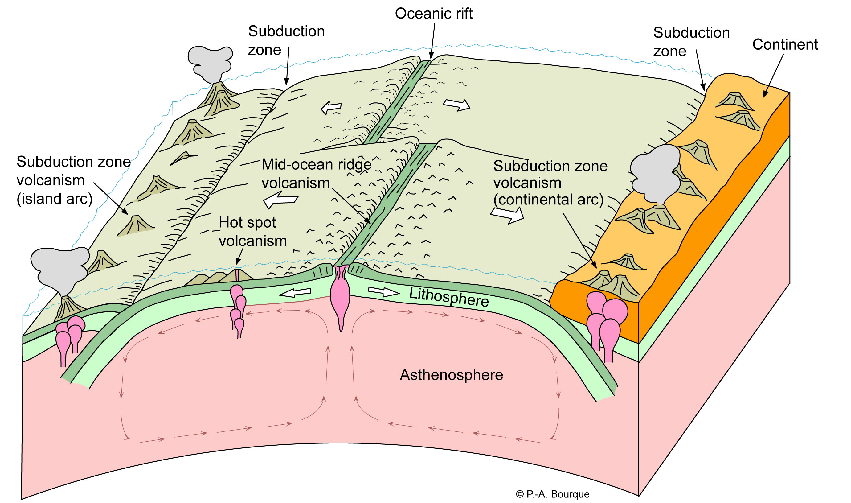 The processes by which magma and its associated gases rise into the Earth's crust and are extruded onto the Earth's surface and into the atmosphere (adapted from: Neuendorf et al., 2005).